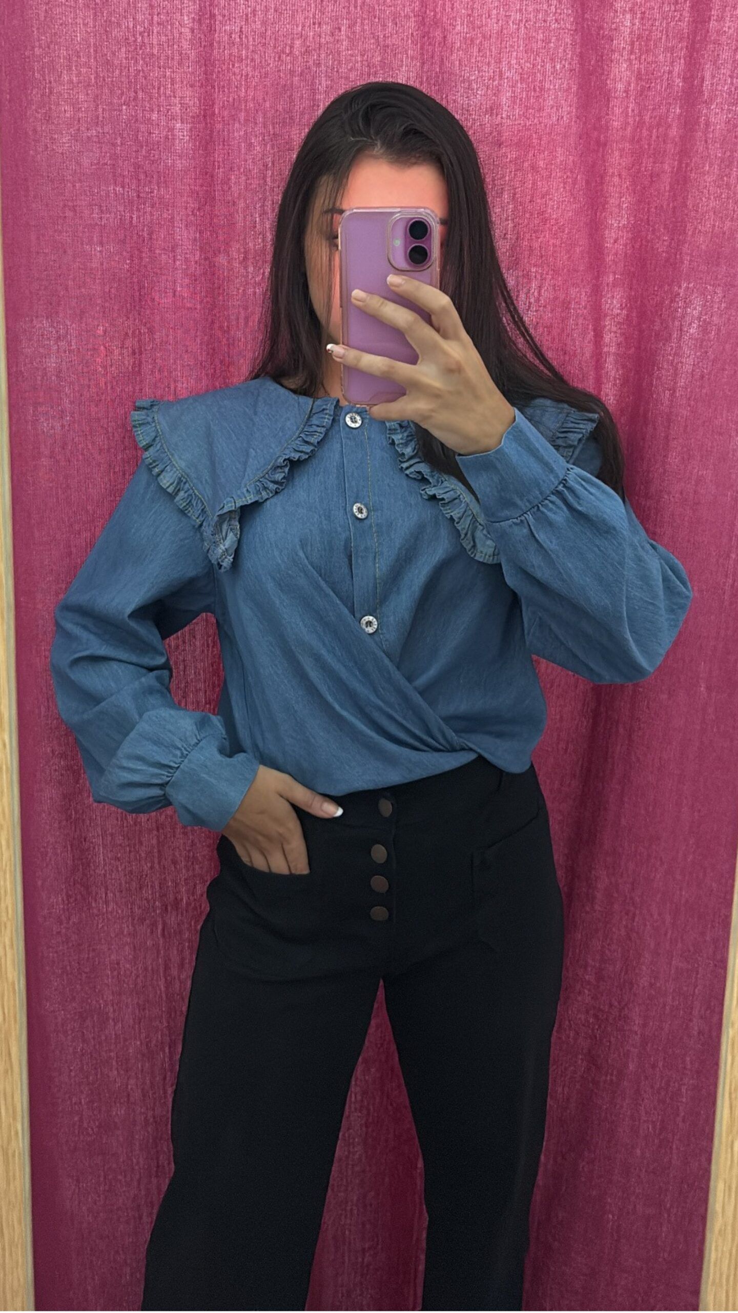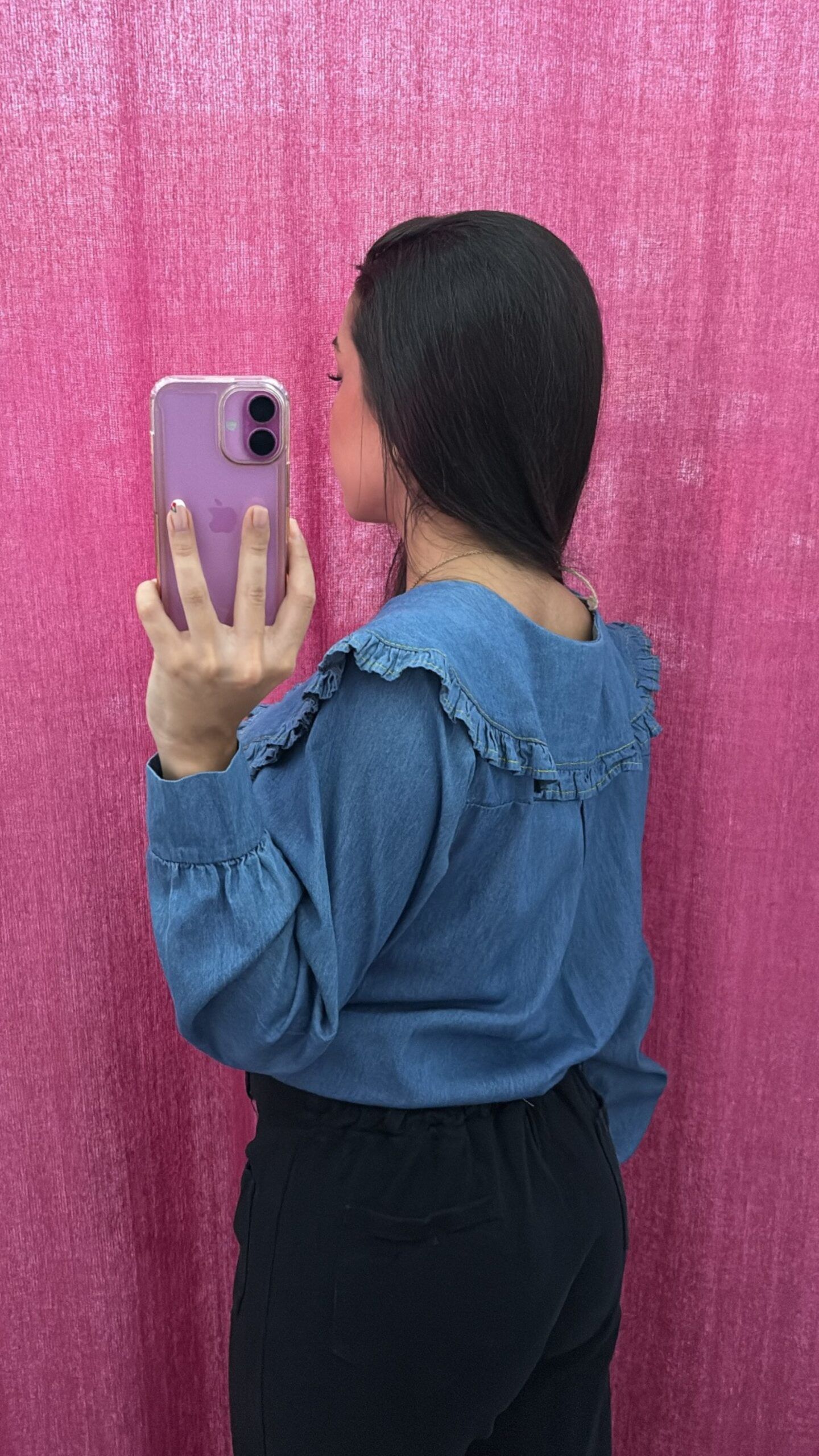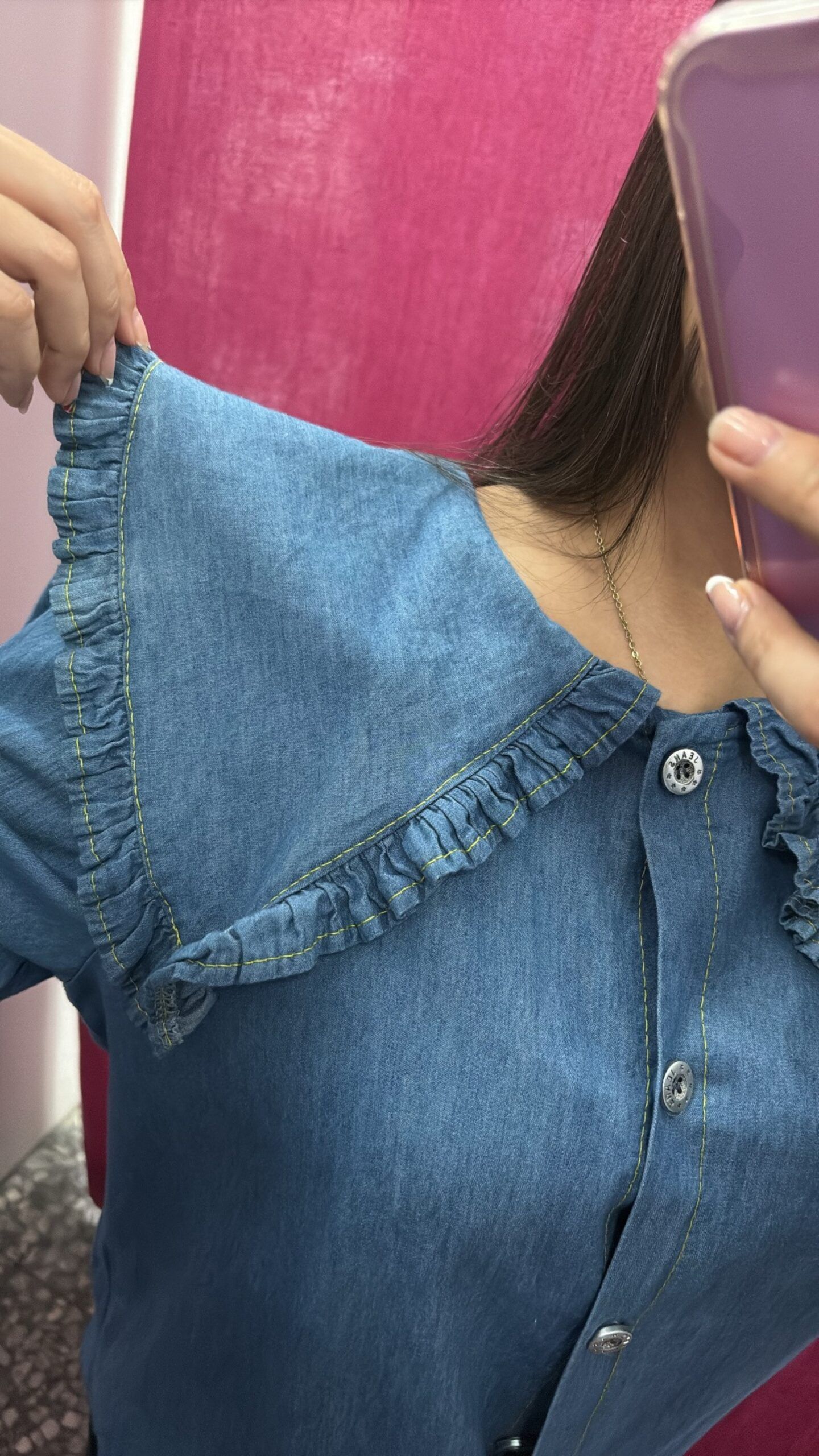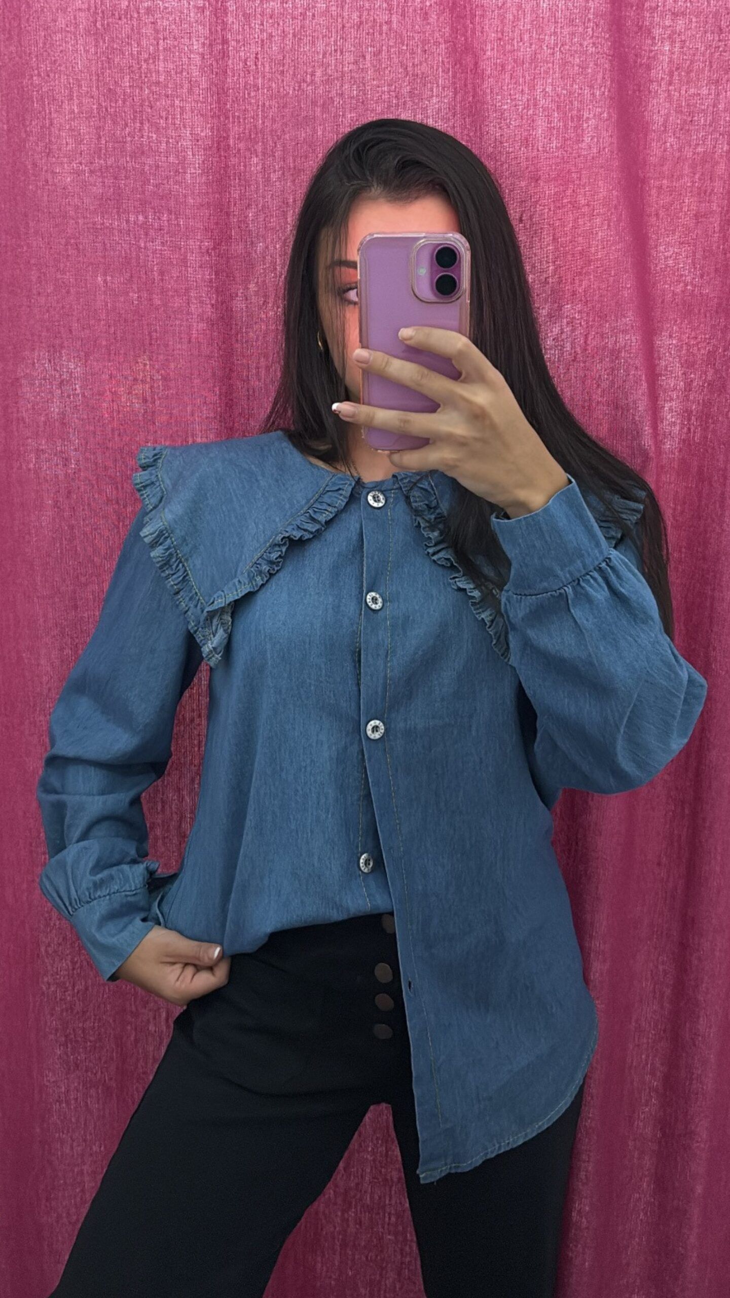 Camisa de cuello bebé en pico con volante, manga larga y detalle de hilo amarillo en el bordado. Talla: Única. Color: Vaquero. Puede dar desde una talla 36 hasta una talla 42. Composición: 50% Poliéster 50% Viscosa.
