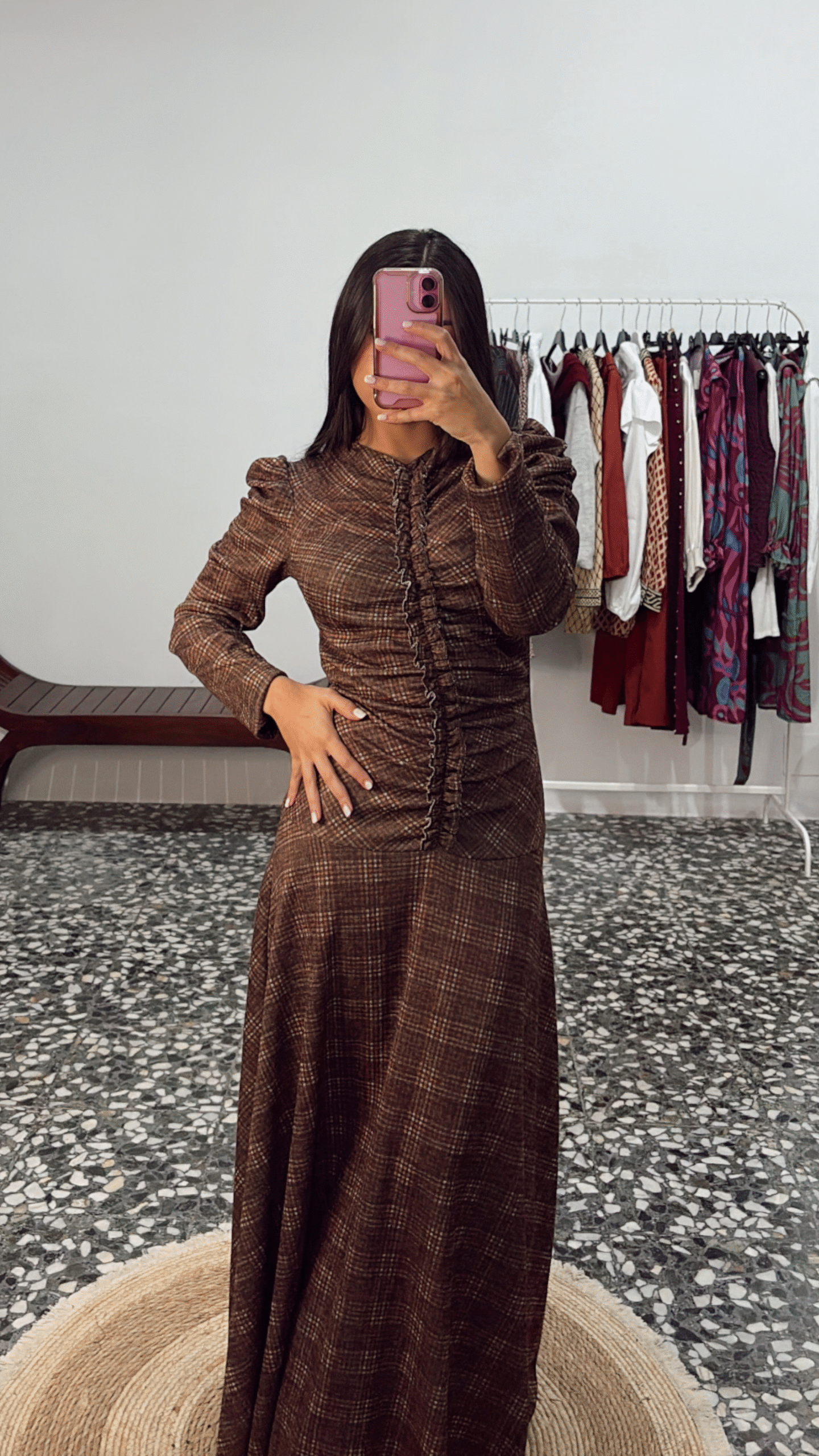 Vestido largo con estampado de cuadros y fruncido en la parte delantera. Talla: Única. Puede dar desde una talla 34 hasta una 40. Color: Marrón chocolate.